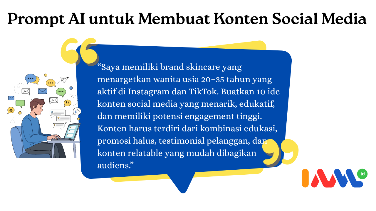 Dengan prompt yang tepat, AI dapat membantu menghasilkan ide konten, caption, script video, hingga strategi campaign yang lebih terarah.