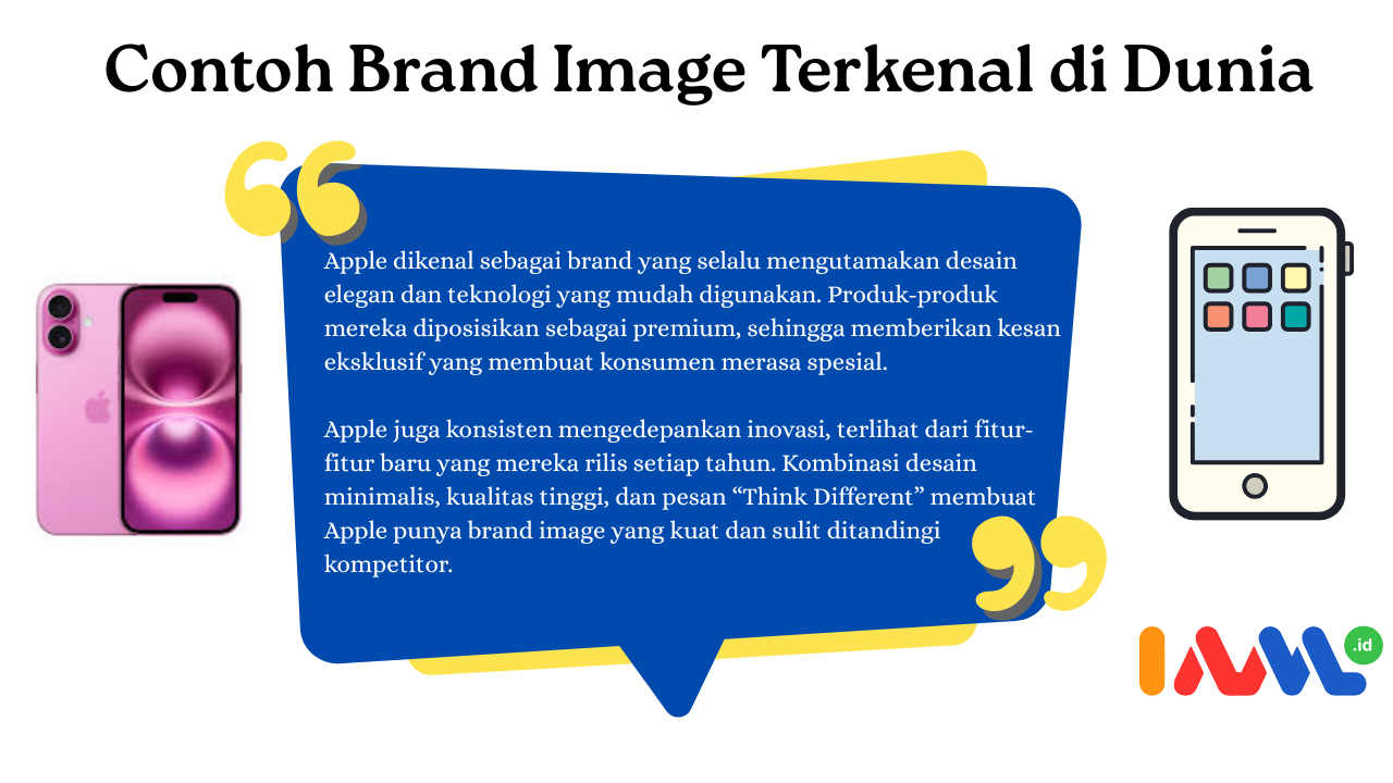 Apple juga konsisten mengedepankan inovasi, terlihat dari fitur-fitur baru yang mereka rilis setiap tahun. Kombinasi desain minimalis, kualitas tinggi, dan pesan “Think Different” membuat Apple punya brand image yang kuat dan sulit ditandingi kompetitor.