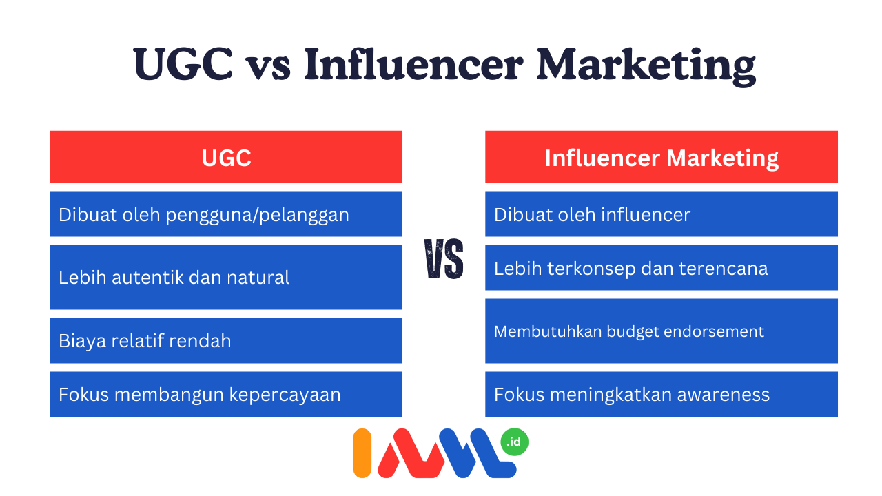 UGC relatif lebih hemat biaya dan mudah dikumpulkan dalam jumlah besar. Influencer marketing umumnya membutuhkan budget lebih besar, terutama untuk influencer dengan audiens besar, tetapi hasilnya bisa lebih cepat dan terukur untuk awareness.