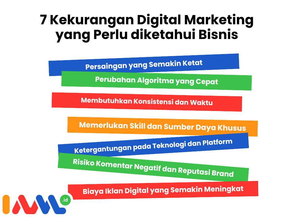 Meskipun digital marketing menawarkan banyak manfaat bagi bisnis, terdapat beberapa kekurangan yang perlu dipertimbangkan seperti persaingan yang ketat, perubahan algoritma, hingga kebutuhan sumber daya yang tidak sedikit.